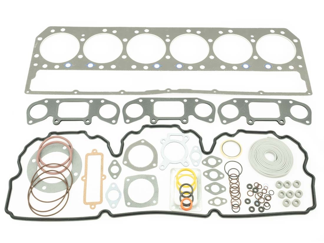 Includes cylinder head gasket, intake and exhaust manifold gaskets, valve cover seals, injector sleeve seals, and related top-end components.