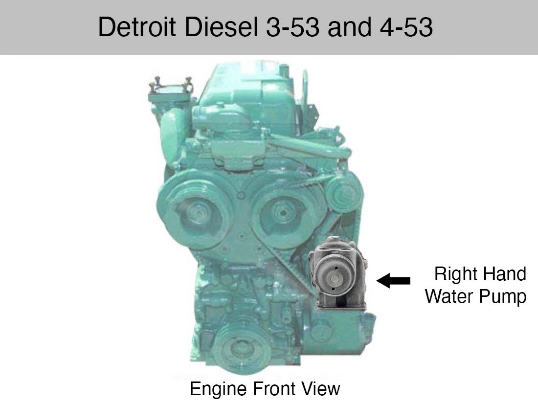Pam air baharu ini direka untuk enjin Detroit Diesel siri 53 — 3-53, 4-53, 6V53 dan 8V53. Ia memastikan peredaran penyejuk yang tepat untuk konfigurasi marin dan industri dengan putaran kanan. Perumah besi tuang bermesin dan impeller seimbang memberikan aliran optimum serta jangka hayat galas yang panjang. Foto 1 menunjukkan dengan jelas kawasan bertanda dan anak panah pada badan pam bagi membezakan model putaran kanan ini daripada versi kiri.